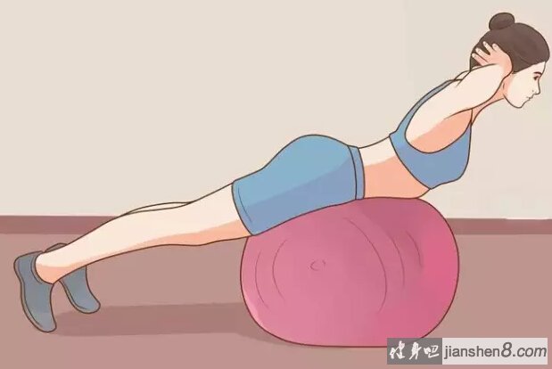 在做这个动作前,你先要伸展身体,让肚子和骨盆部位轻轻靠在健身球上。将手放在头后面,向上拉伸头部和颈部,从而使背部向下凹陷。健身球会支撑你的身体,并帮助脊柱自然弯曲。