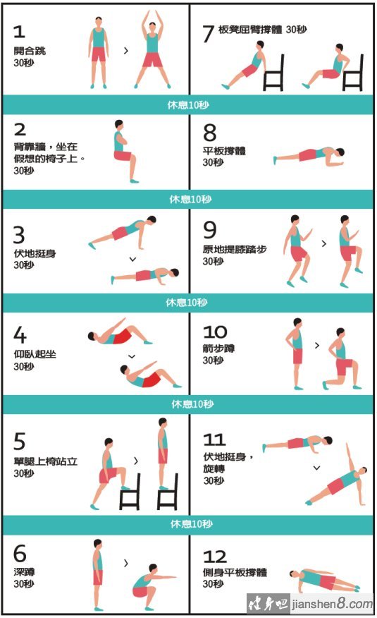 练习最好迅速的接续进行,每一项持续30秒; 7分钟科学运动,是由12组动作结合而成,不需任何器材,只需要一张椅子和一面墙,随时地都可训练。 1.每个动作须持续进行30秒,次数为15-20次(可依个人情况调整)。 2.每完成一个动作,必须休息10秒,再进行下一组动作。 3.约7分钟左右可完成12个动作。 |