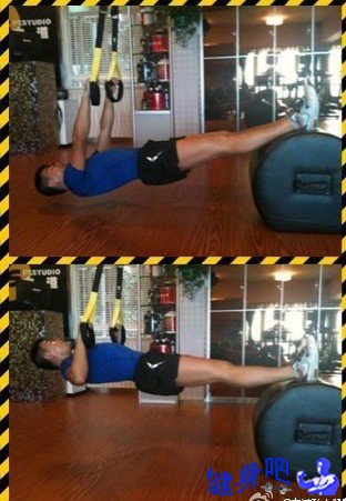 TRX训练动作:背部训练,目标肌肉为背部肌群及肩部后侧肌肉。