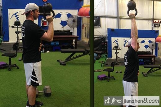 ![]() 打造强悍的肩部核心:壶铃倒立推举! 过头推举是我们健身训练中比不可少的菜单!很多人在操作推举时常常会因为肩部稳定性不足而丧失良好的训练效果! 今天要介绍一个动作来帮助你强化肩部的稳定性! 把壶铃倒过来进行推举 优点: 1.构建强悍的肩部稳定性:倒过来的壶玲十分不容易控制!你要让你的肩部克服它的摇摆,倾斜,把它稳定住!当你握住壶玲不放,保持手臂静止伸直。重量顺着手臂落到肩膀上!你的肩部稳定肌群需要来工作,保持肩部的稳定! 2.同时,把壶玲倒过来对你的握力也是一个挑战! 3.教你的核心稳定:你的大腿,臀部,腹部和背部都必须保持紧张来构建一个稳定的平台。 ![]() 如何做? 对于刚开始尝试的人群建议使用较轻的壶玲! 步奏一:先尝试静止的支撑动作 1.动作顶端的静止动作 站姿,单手抓住壶玲把手,持壶玲(倒立)伸直在头顶,中心落在肩胛骨上!然后保持15秒!保持肩部稳定,HOLD住壶玲,去控制壶玲不让他晃动!如此反复! 注意收紧你的大腿,臀部和核心肌群让它们稳定躯干,并保持你的肋骨下压,避免过度耸肩,头部前倾。 2.动作底端的静止动作 正确壶铃握姿。(如图)