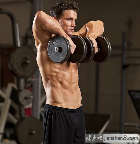 哑铃直立划船与杠铃直立划船动作很相似竖直站立并上挺胸部收紧你的腹部能够帮助你保持躯干的稳定。