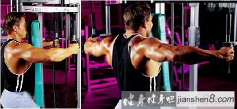 3、一直摆臂到达体侧为止,并且挤压片刻。双臂在充分的控制下,慢慢返回起始姿势,如此重复。整个锻炼过程保持肘部稍微弯曲。