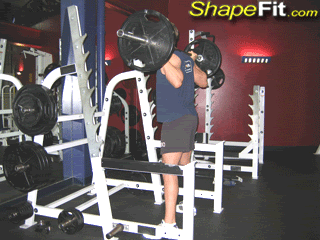 ![]() (3)杠铃深蹲 :就是传统深蹲动作,相比颈前杠铃深蹲,颈后深蹲承受重量大、更安全;既能发达股四头肌,也能发达臀肌,因此是一般人的首选。