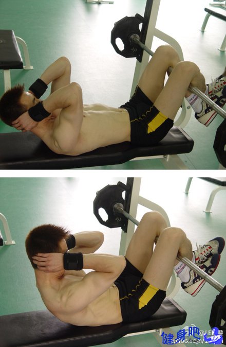 【搁腿仰卧起坐 真人示范】仰卧,小腿搁在杠上,大腿垂直于地面,两手交叉在胸前或互抱于颈后。慢慢地使两肩向膝部弯起,直至肩肿骨离地面1~2英时,保持静止一秒钟。然后,回复到开始位置。收腹时吸气,还原时呼气。当屈体收缩时,为了使腹部肌群收缩,使下背紧贴地面。这次大家不要再说看不懂了哈~