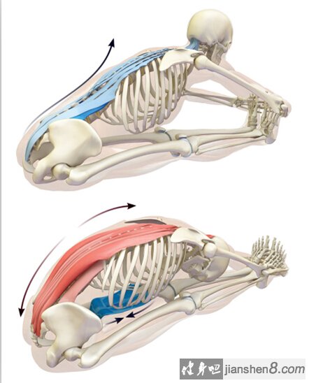 棘肌在最内侧, 分为胸棘肌, 颈棘肌, 与头棘肌 胸棘肌的下端同样与其他竖脊肌共用, 上端连接在胸椎第三到第八节的棘突上 颈棘肌的下端连接在第六颈椎到第十二胸椎棘突上,上端接在第二颈椎棘突, 有时会延伸到第三会第四颈椎 头棘肌的下端连接在下颈椎与上胸椎棘突上, 上端连接在上下颈线处 动作是后弯, 同侧侧弯, 而只有头棘肌会做出同侧旋转 4.伸展的基本原则就是往反方向做动作 但如果缺少了脊椎间的相对动作,反而会无法伸展到我们想要的区域