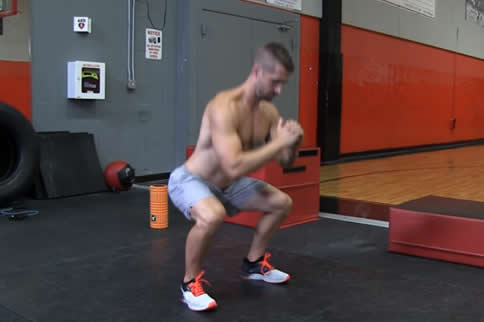 挺直腰背,双脚与肩同宽,膝盖和脚尖方向一致,双手伸直,手臂前平举,掌心相对,臀部下蹲与地面平行时蹲起,训练全程保持腰背挺直,下蹲时吸气,起身时呼气。