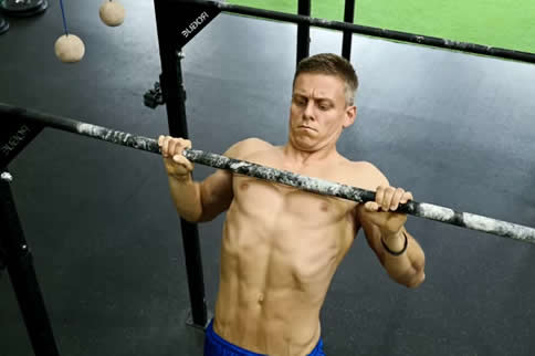 双手比肩稍宽,拇指与四指在同一方向,小臂垂直于地面。挺胸,身体尽可能垂直上下运动。腰腹、臀部、双腿始终绷紧,不可放松,下落时不要完全下到底,保持肩部背部始终发力。