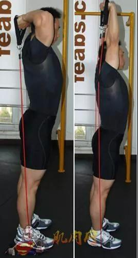 动作要领:两脚平行站立,将绳踩在脚下,两手握手柄在头后,两个大臂固定,吸气,呼气时向上伸展手臂,吸气时还原。这个练习易犯的错误是手的位置向下过低,容易造成肘关节的损伤,手臂弯曲时,夹角略小于90°就可以,向上伸直时不要锁定肘关节。