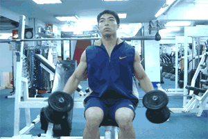 ![]() 1.正坐,挺胸,收腹,立腰,或上背及骶部靠垫,腰部空出;双臂微屈,双手掌心相对握持哑铃。